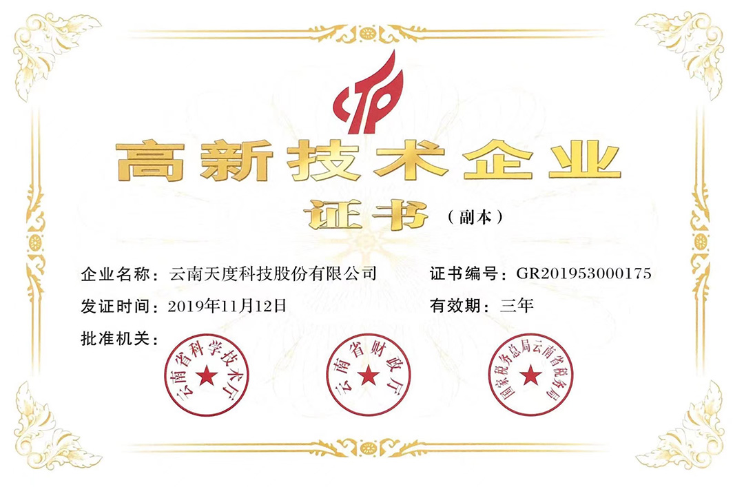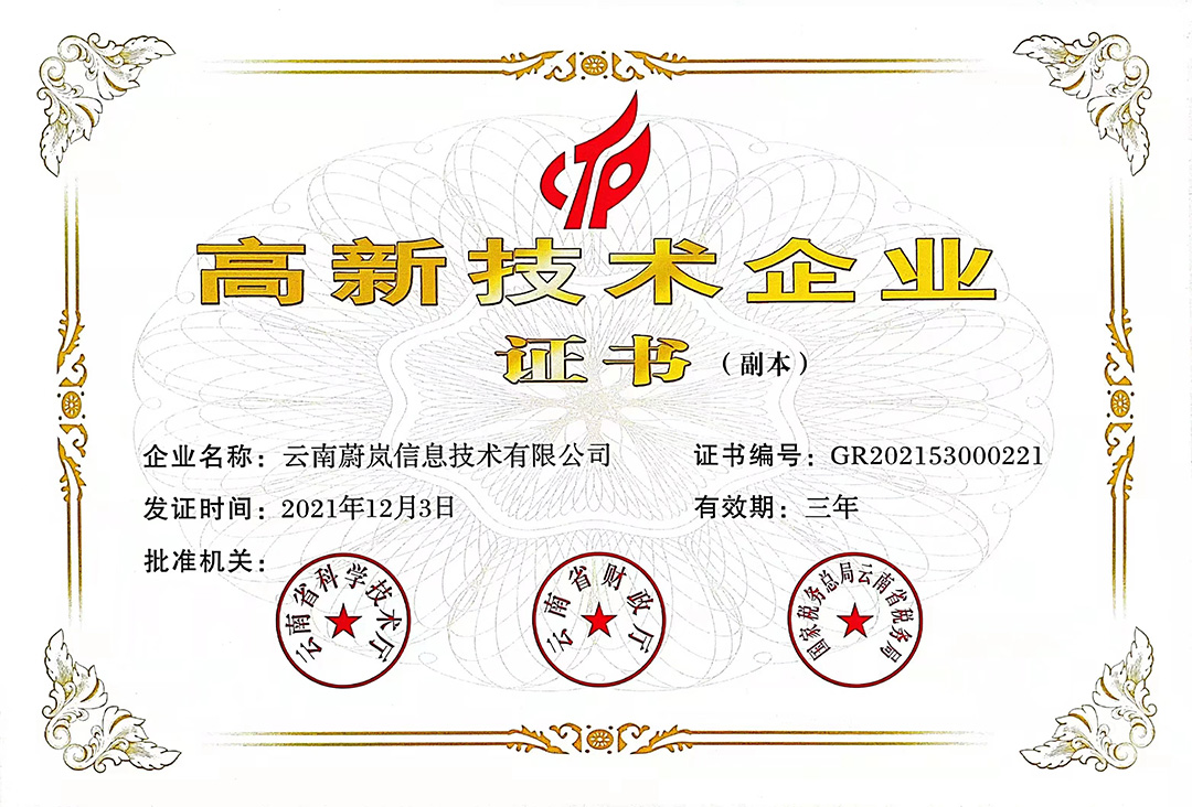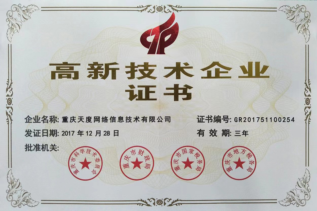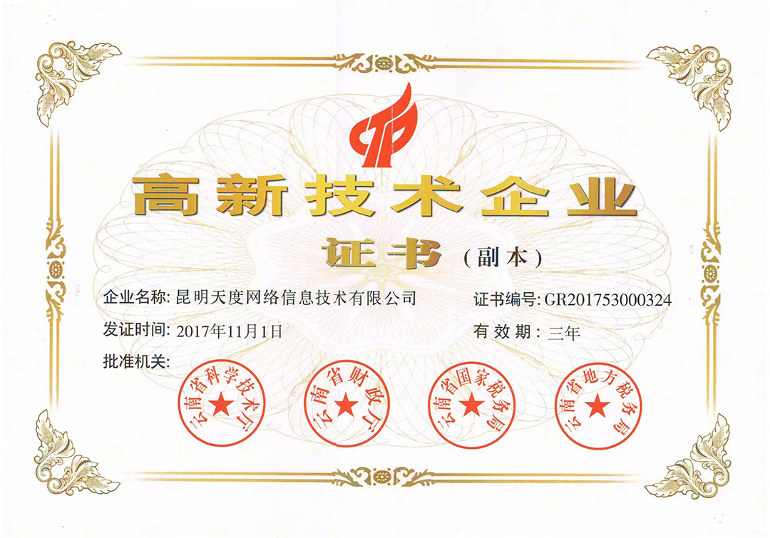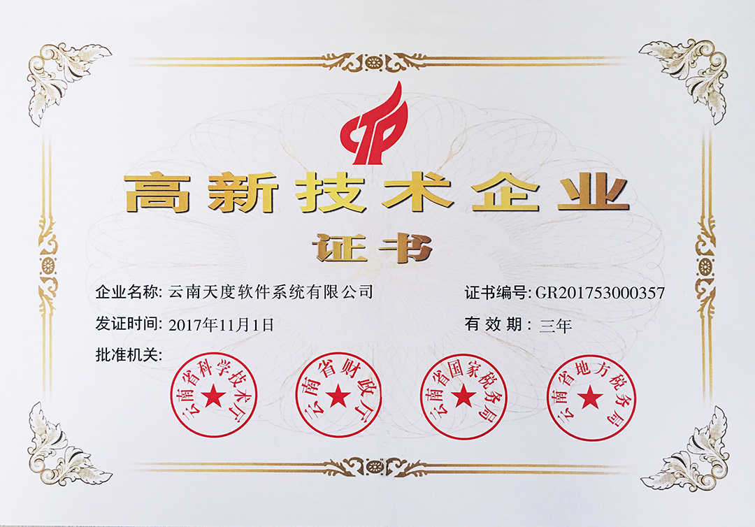 云南天度集團(tuán)旗下云南蔚嵐信息技術(shù)有限公司、云南天度科技股份有限公司、云南天度軟件系統(tǒng)有限公司、昆明天度網(wǎng)絡(luò)信息技術(shù)有限公司、重慶天度網(wǎng)絡(luò)信息技術(shù)有限公司等5家企業(yè)獲得國(guó)家高新技術(shù)企業(yè)認(rèn)定。
