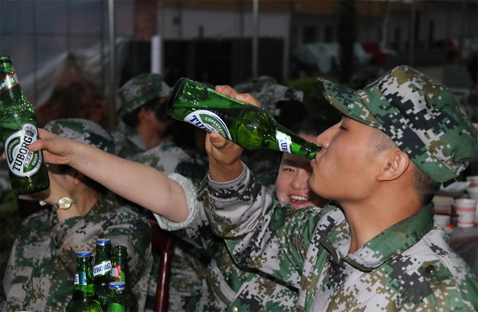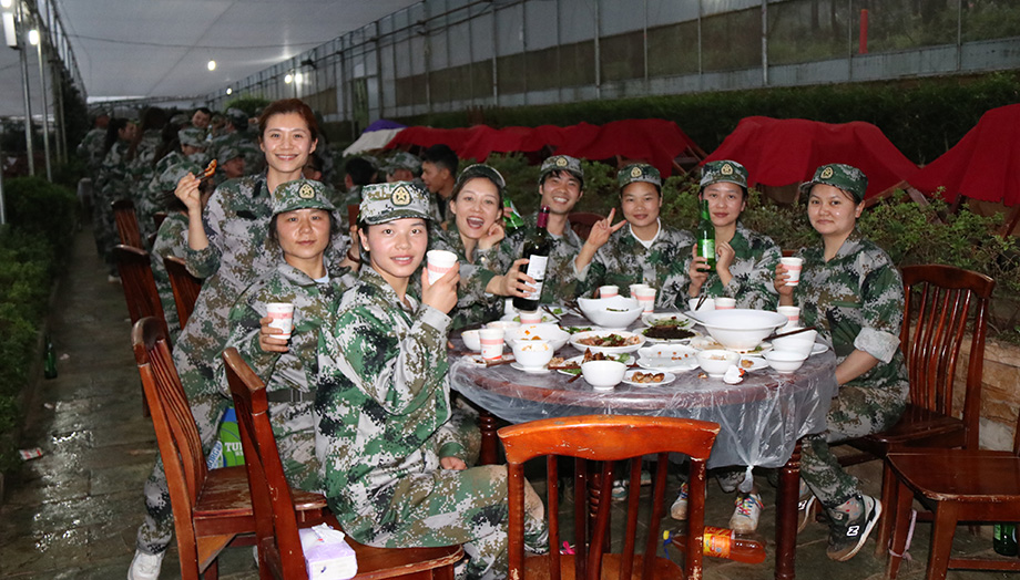 下午訓(xùn)練結(jié)束集合的時候,教官突然宣布說晚上有聚餐,大家頓時像炸開鍋一樣的,畢竟我們這兩天吃盒飯吃得眼睛都要冒綠光了,能在這么艱苦的時候有一桌大肉吃,真的讓大家有一種撿到錢的幸福感。晚餐的氣氛異?;钴S,行政部妹紙們也貼心地給大家準(zhǔn)備了酒水助興。