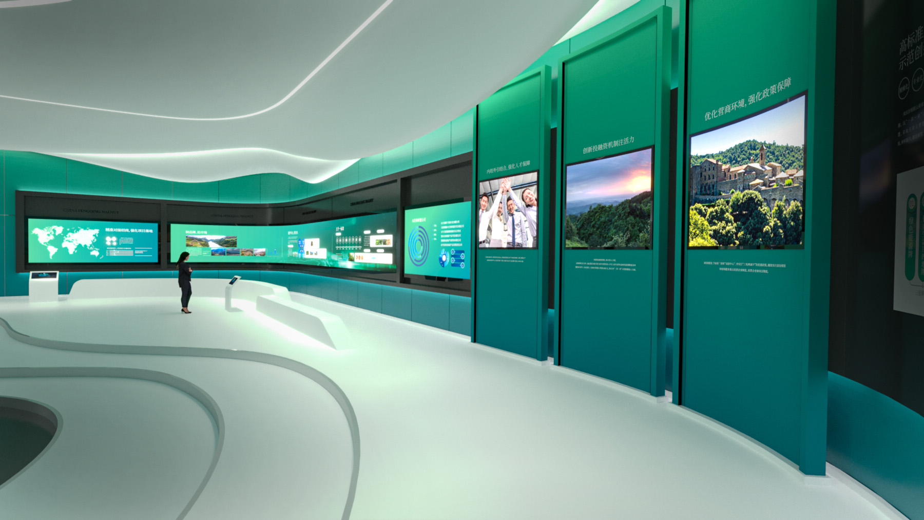 天度集團(tuán)擁有專業(yè)的展廳展館主題策劃、內(nèi)容制作、硬件集成、場(chǎng)館設(shè)計(jì)及施工團(tuán)隊(duì),以多媒體和數(shù)字化技術(shù)作為展示技術(shù)、最新的影視動(dòng)畫技術(shù),結(jié)合獨(dú)到的圖形數(shù)字和多媒體技術(shù),實(shí)現(xiàn)人機(jī)交互方式的展廳形式,集各種多媒體展覽展示系統(tǒng)為一體的綜合展示平臺(tái),包括數(shù)字沙盤、環(huán)幕/弧幕/球幕影廳、迎賓地幕系統(tǒng)、互動(dòng)吧臺(tái)、虛擬漫游、LED拼接屏、互動(dòng)鏡面及觸摸屏等實(shí)現(xiàn)數(shù)字化展廳一站式解決、實(shí)施方案。