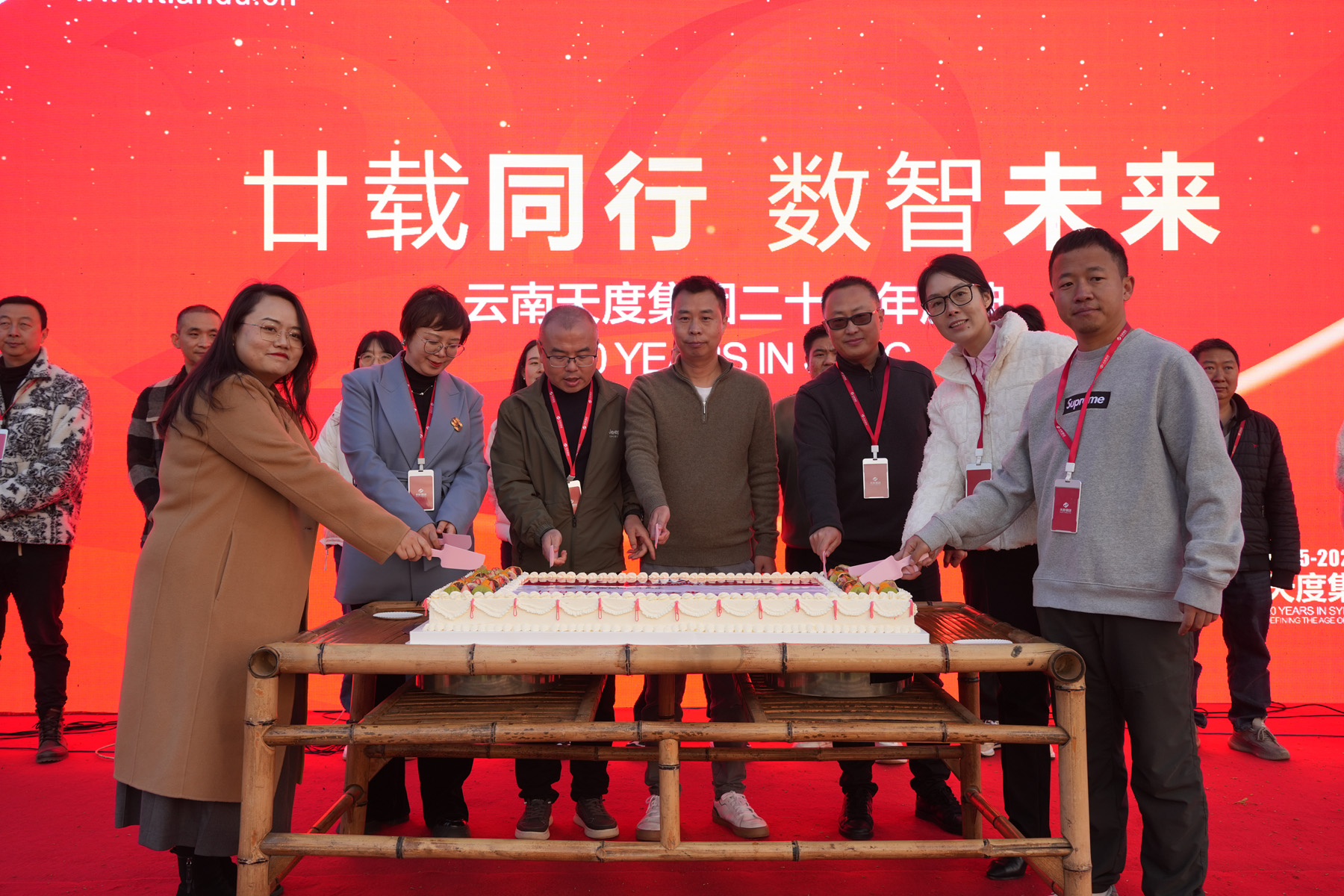 隨后,鄭桂文董事長(zhǎng)率集團(tuán)高管團(tuán)隊(duì)共同切開(kāi)精心設(shè)計(jì)的二十周年巨型慶典蛋糕。甜蜜的喜悅,由所有天度人共同分享,將現(xiàn)場(chǎng)氣氛推向首個(gè)高潮。
