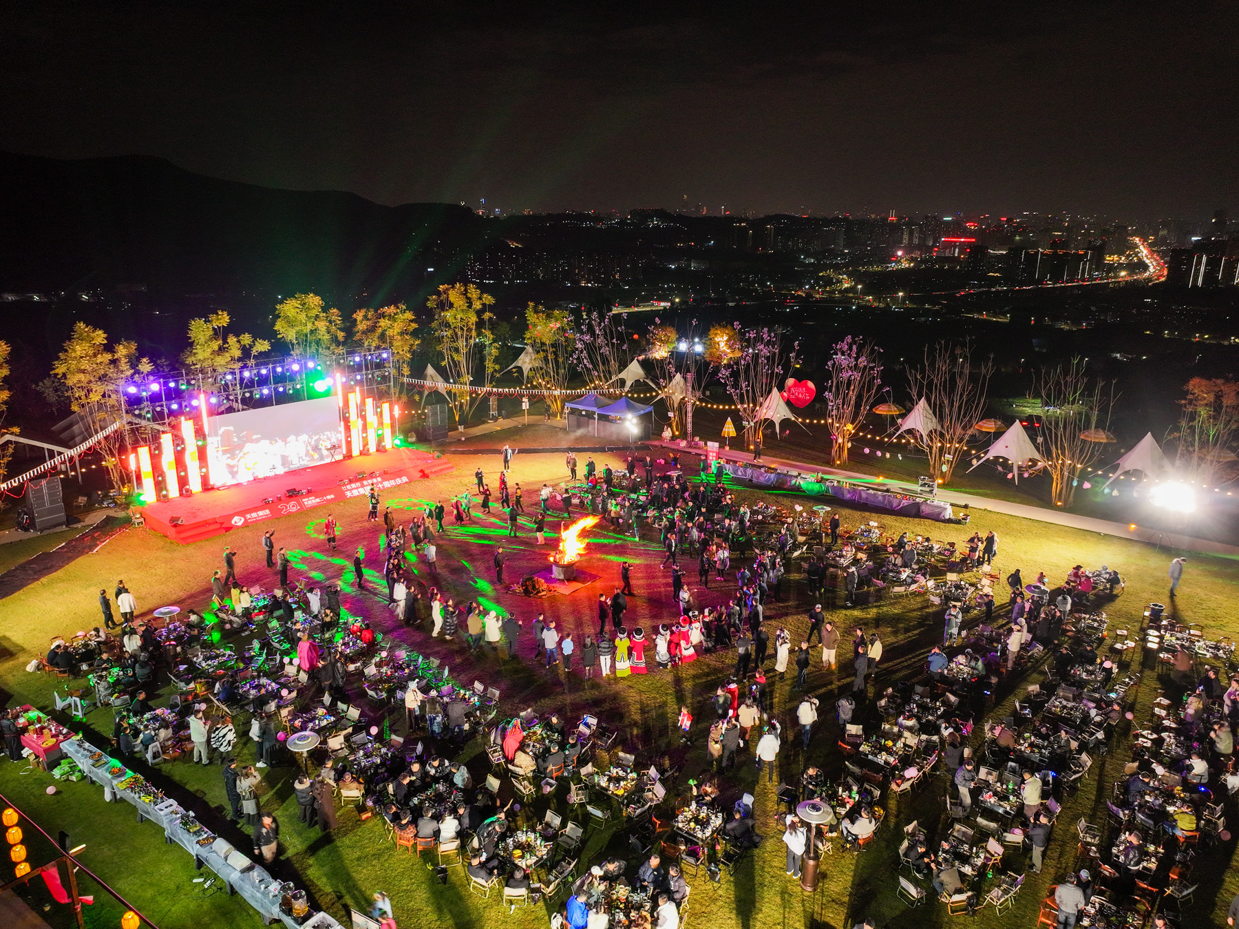 傍晚六點(diǎn)半,在眾人期盼中,集團(tuán)創(chuàng)始人鄭桂文先生手持火炬,莊嚴(yán)點(diǎn)燃中央主篝火?;鹧嫔v的剎那,溫暖與光明映照每一張笑臉,象征天度人凝心聚力、薪火相傳的奮斗精神。 篝火既燃,熱情引爆!在專業(yè)打跳團(tuán)隊(duì)的帶領(lǐng)下,所有人手拉手,圍著熊熊篝火,跳起歡快的民族打跳。歌聲、笑聲、腳步聲交織成歡樂(lè)的樂(lè)章,現(xiàn)場(chǎng)化作一片沸騰的海洋。